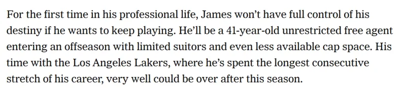 职业生涯第一次,如果他还想继续打球,将不再完全掌握自己的命运。他将以41岁的年龄成为完全自由球员,进入一个潜在追求者有限、薪资空间更有限的休赛期。他在洛杉矶湖人的时光——也是他职业生涯最长的连续效力阶段——很可能在本赛季结束后画上句号。